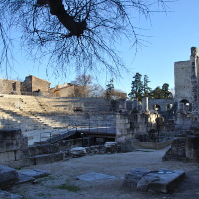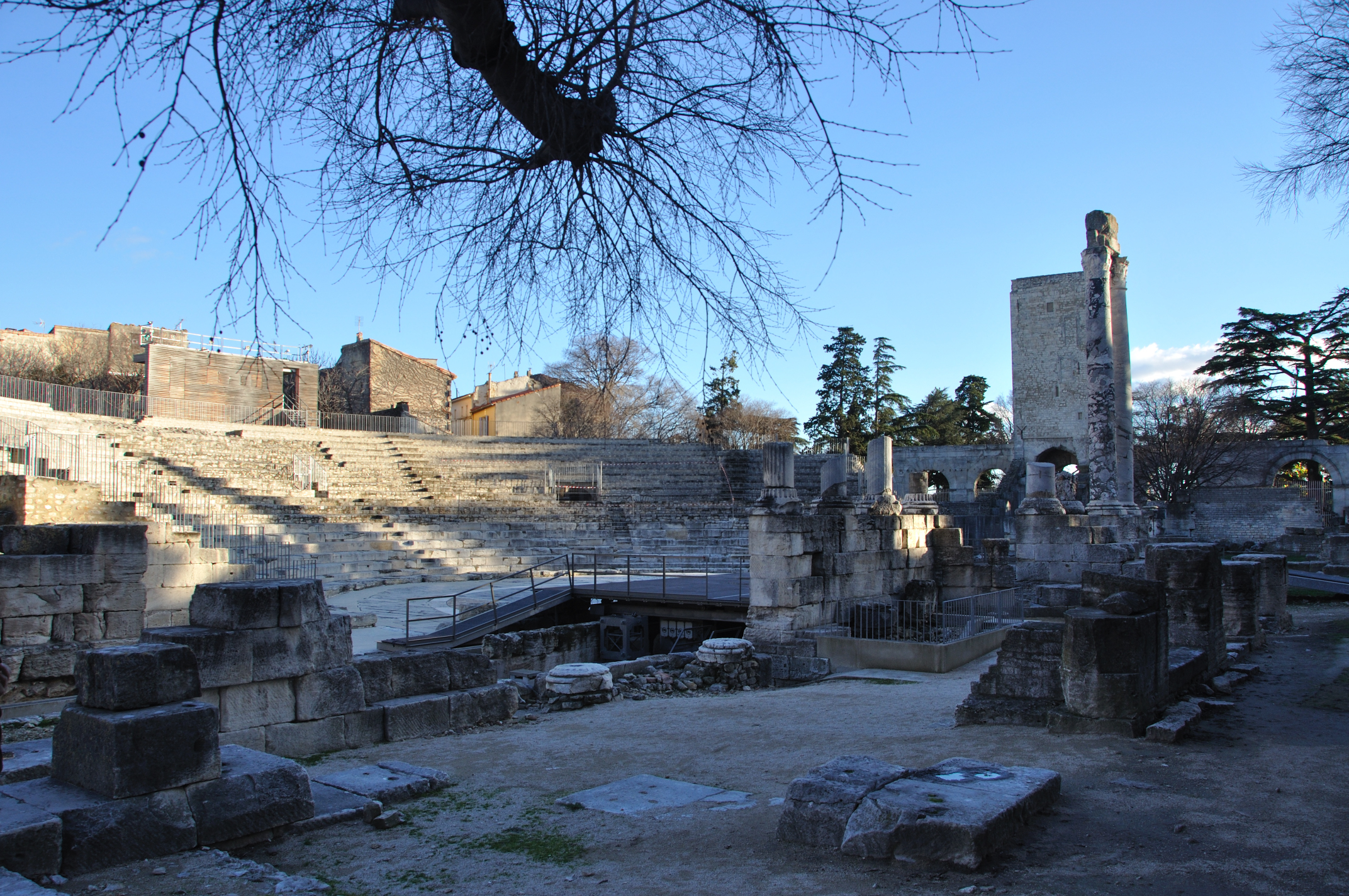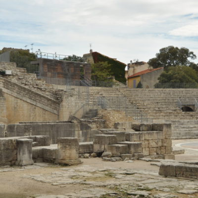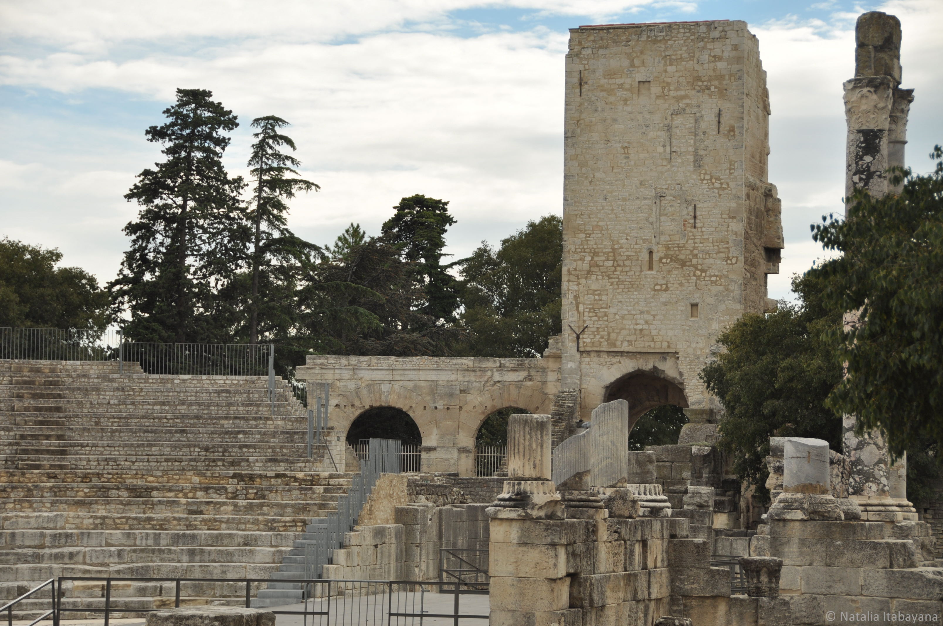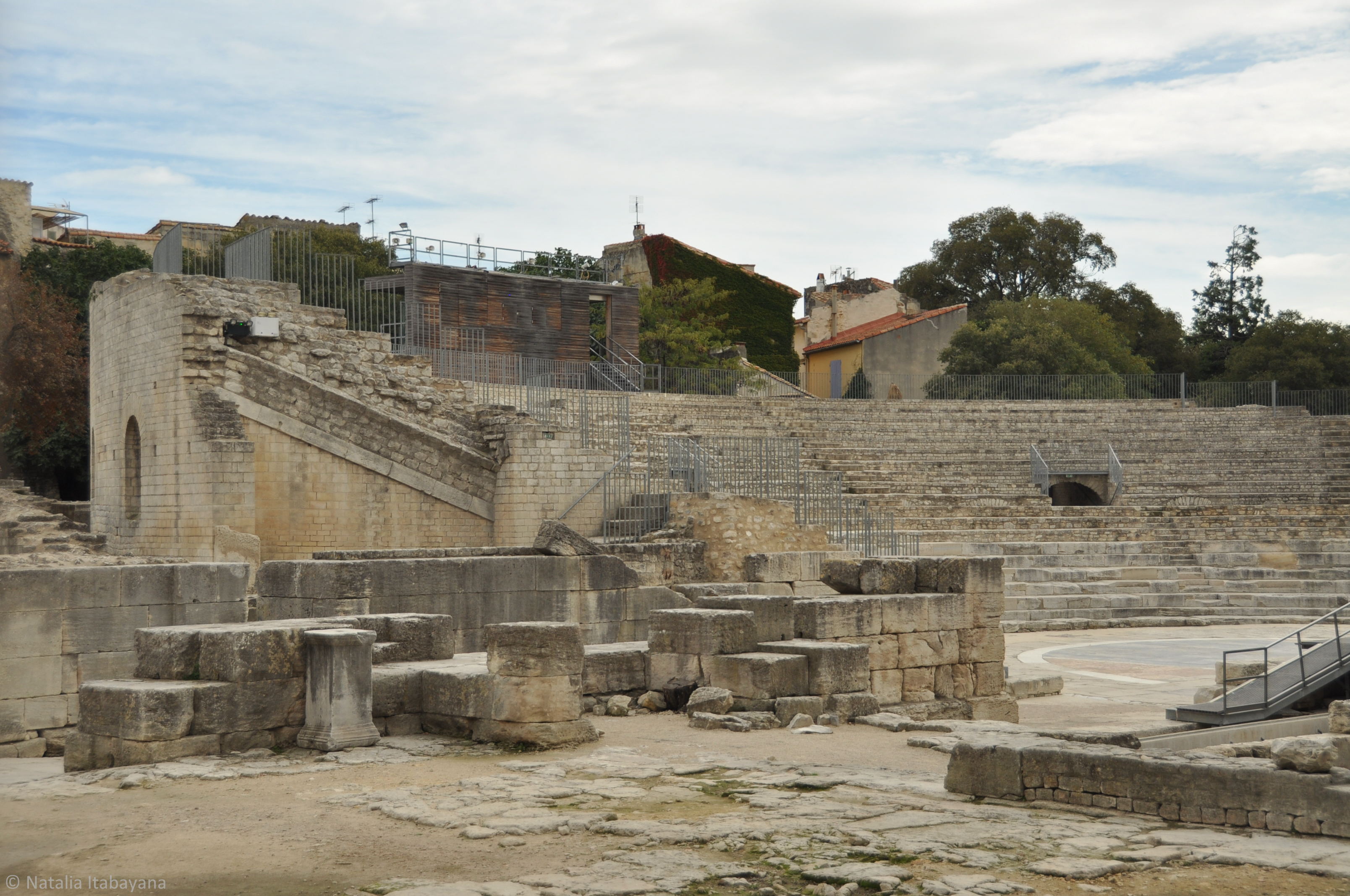 Arles tem um imenso patrimônio romano a ser descoberto, a começar pela dobradinha Teatro Antigo e Anfiteatro romano. O teatro antigo ainda preservar uma parte de sua formação original, mas as intermitências do tempo e contextos históricos se mostram presentes. Ainda assim, é possível ter uma dimensão da imponência do lugar que outrora serviu de palco para o entretenimento cultural local. Também é possível visualizar a estrutura original em maquete que se encontra no Museu de Arles antiga.