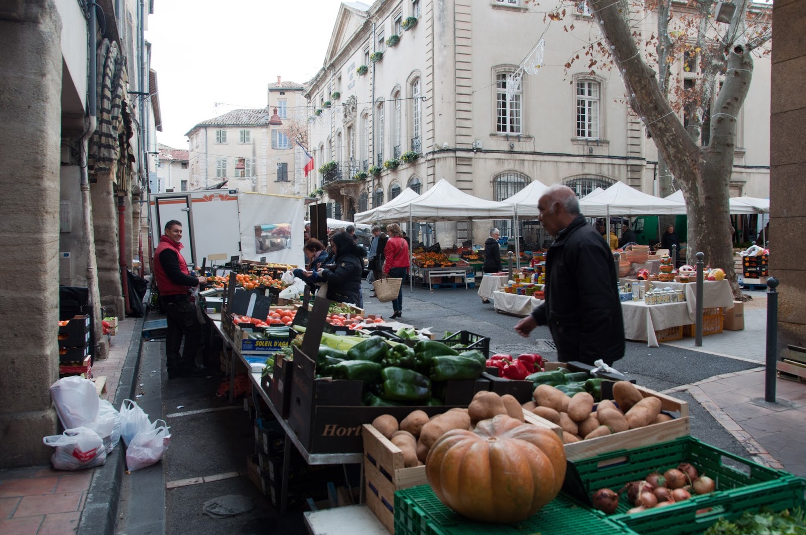 Do outro lado da rua, em frente ao Office du Tourisme da cidade, que ocupa o edifício do antigo teatro, as deliciosas e reputadas trufas da região eram comercializadas aos varejistas, numa feira que acontece todas as sextas-feiras pela manhã. Além da feira das trufas, as ruas da cidade estavam ocupadas por feirantes, numa das maiores e mais famosas feiras provençais da região, com cerca de 350 expositores e produtores. Cheguei no dia certo pra aguçar paladar, olfato e encantar os olhos.