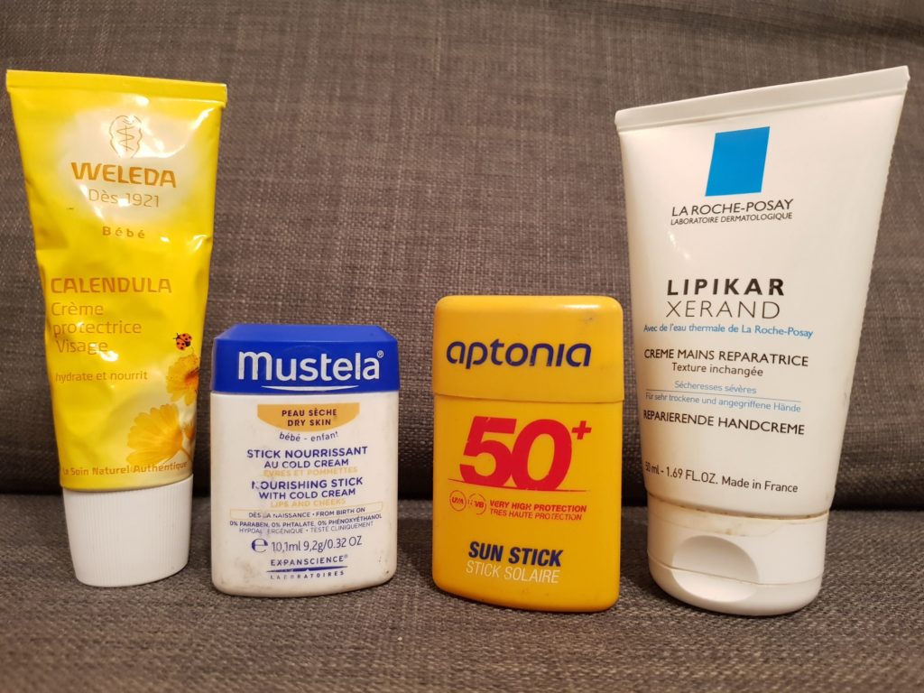 Gosto muito de usar nas bochechas e lábios um protetor pra bebês e crianças da Mustela (o mesmo que uso no Vic) e também usamos creme hidratante da Weleda à base de calêndula pra hidratar o rosto (além de formar um película protetora, também funciona como cicatrizante caso o frio tenha castigado muito a pele). Quando vamos pra montanha, usamos protetor labial com filtro solar 50, que garante tanto a proteção contra o frio como do sol, que na montanha queima muito a pele!