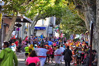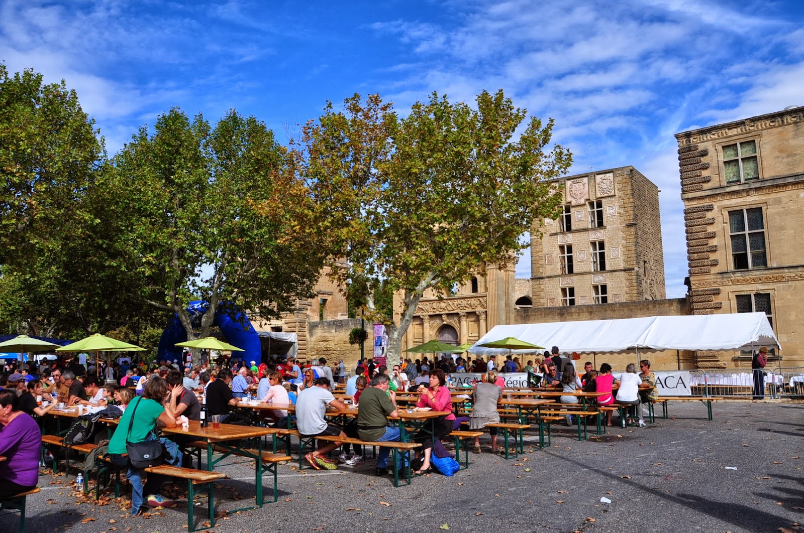 5- Almoço de confraternização e feira de produtos regionais na chegada. Quem não quiser encarar o percurso e preferir ir direto pro ponto de chegada, pode aguardar os corredores na agradável feira organizada especialmente pro evento, além de um almoço-degustação. No site da maratona é possível fazer a reserva pro almoço, que é aberto ao público no limite da disponilidade de lugares, e a participação na corrida não é exigida. Os comensais estavam bem arrumadinhos, as mesas lindamente dispostas, com uma vista impressionante pra região, além do contato com provençais autênticos, aquele momento de convivialidade com os locais que muitos viajantes buscam. Claro que me arrependi de não ter participado. Fica pro próximo ano.