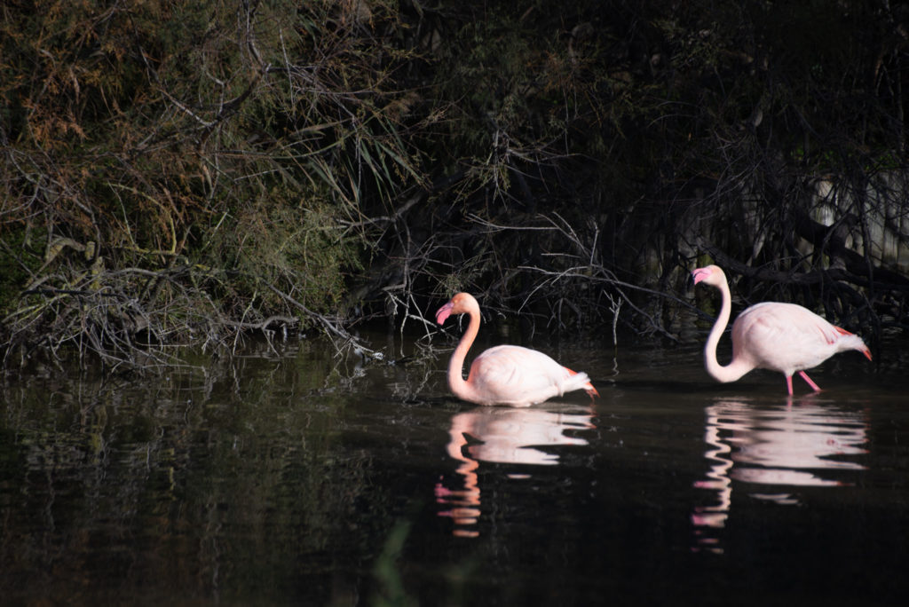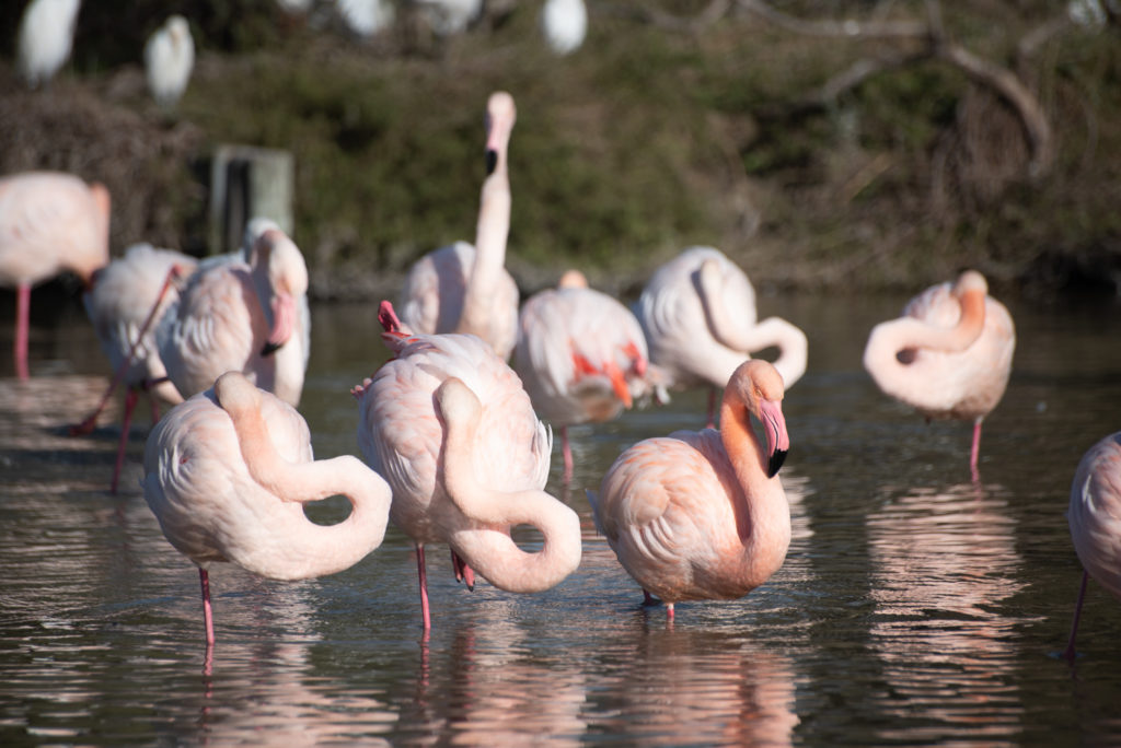 Os cerca de 1500 flamingos que fazem pouso no parque ornitólogico são da espécie europeia, conhecidos como grandes flamingos. No parque todos são identificados com pulseiras numeradas, o que possibilita aos estudiosos de traçar um perfil de comportamento, assim como acompanhar os movimentos migratórios das aves. Os flamingos vivem em média 40 anos, reproduzem-se no período do inverno (época ideal para visitar o parque, entre novembro e março) e colocam um ovo a cada ano. Ambos macho e fêmea se revezam para chocar o ovo.