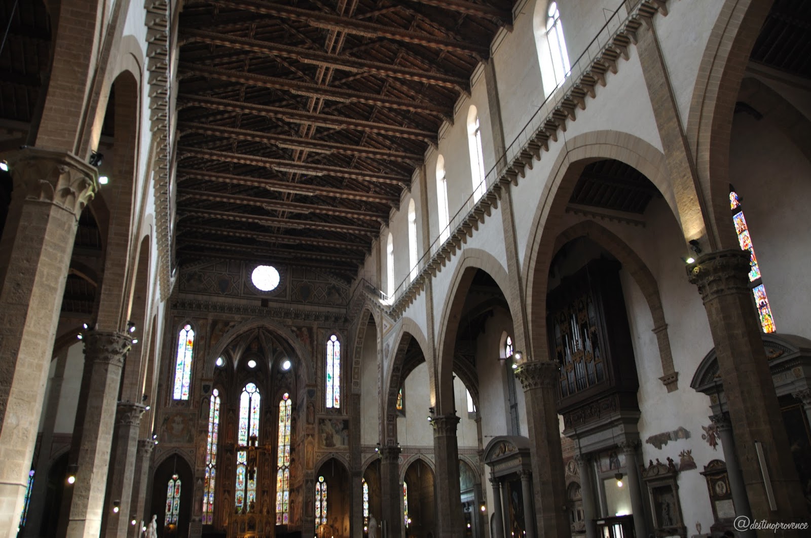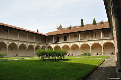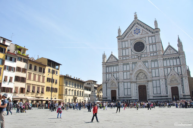 Santa Croce foi a segunda igreja que visitamos, e onde ficamos por mais tempo. A única fila que encaramos foi pra compra do ingresso (6 euros por pessoa em maio de 2014), e era uma fila bem pequenina. Como estávamos com a Luna, eu fiz a visita enquanto Bernardo aguardou na praça, e depois trocamos. Tão logo me vi dentro da nave da igreja, meus olhos marejaram, a emoção de me encontrar sob o teto onde repousam Michelangelo, Machiavel, Galileu e Rossini me invadiu ao longo de toda a visita. Ao caminhar através da nave da igreja, me sentia cada vez mais pequena diante de nomes de grandes figuras históricas. A visita continuou ainda além da igreja, no antigo refeitório ainda marcado por uma grande enchente do rio Arno, e terminou no belo claustro florido. Depois de terminada a visita do lugar, ainda flanamos pelas ruas de Florença, atravessamos o Ponte Vecchio e nos despedimos da cidade de Dante Alighieri para seguir viagem rumo a Siena.
