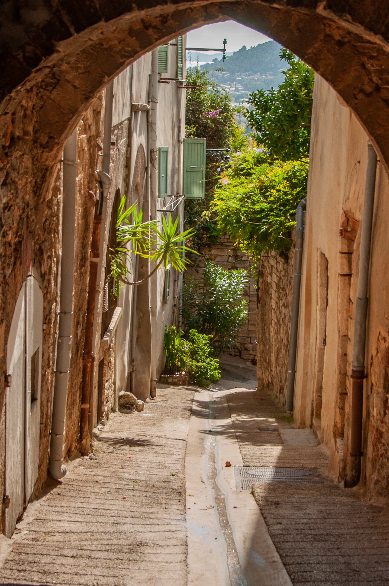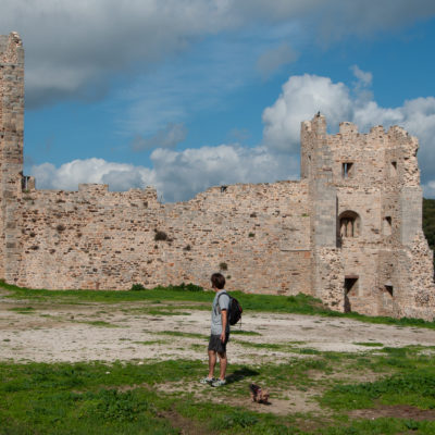 O centro de Hyères mistura o estilo de arquitetura provençal com características que atravessaram a idade média, como as ruelas estreitas que se extendem ao redor da igreja, dando impressão de um amontoado quando vistas do alto da colina ao pé da qual a cidade repousa. Percorremos as ruelas praticamente desertas do centro em direção ao alto da colina, onde ficam as ruínas da muralha que outrora protegia o castelo medieval que ocupava o lugar, e percorremos os caminhos que atravessam os vestígios da fortificação, até encontrarmos um ponto suficientemente acolhedor e com uma bela vista pra fazermos nosso piquenique. Entre os primeiros cogumelos do outono e as últimas flores estivais, observando a silhueta da ilha de Porquerolles no horizonte azul do mediterrâneo, comemos sem pressa, sem nos preocuparmos em sair correndo pra pegar o barquinho que nos levaria à ilha. Passamos em frente à Villa Noailles, um centro de arte que recebe festivais mas estava fechado no horário que chegamos.