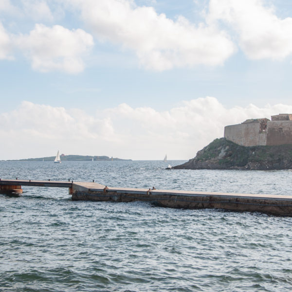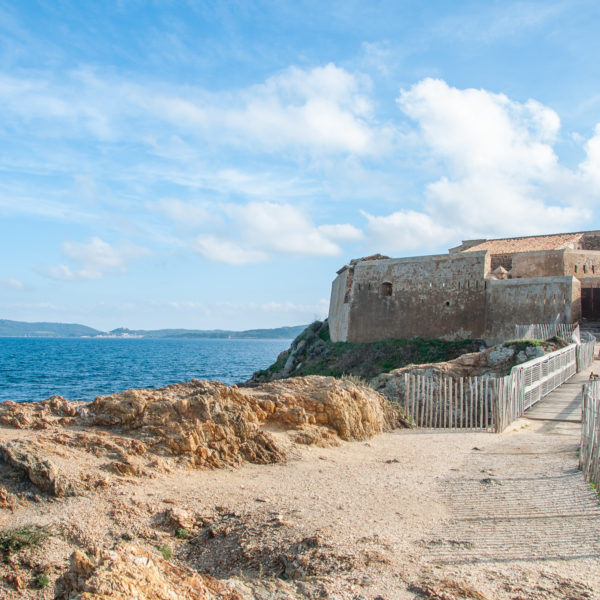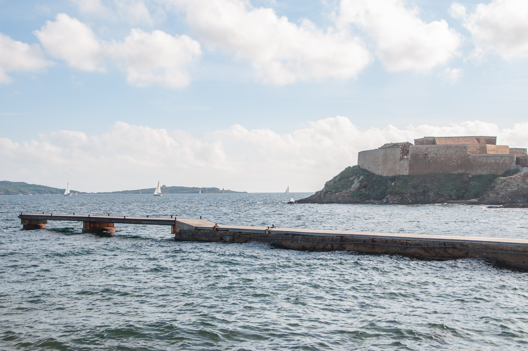 Cerca de 12km separam o centro de Hyères da Presqu’île de Giens, e o trajeto pode ser feito de carro ou ônibus municipal – linha 67, veja o itinerário neste link – que parte do centro da cidade até a Tour Fondue, local de embarque para as ilhas. Como estávamos de carro e era meados de outubro, quase fim de tarde, pegamos pouquíssimo trânsito pra chegar até a península, mas acabamos não embarcando no último barquinho pra Porquerolles porque teríamos pouquíssimo tempo pra visitar a ilha com calma. Demos uma volta pelo porto e ficamos contemplando o mediterrâneo e o forte construído no século XVII, a “Tour Fondue”. Foi ali que terminou nosso passeio, depois de um tombo monumental que tomei à beira d’água, mas consegui evitar um desastre maior e não deixei a câmera bater no chão, foi só o cotovelo mesmo!