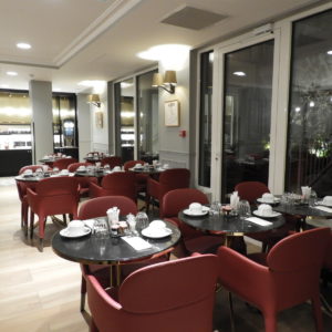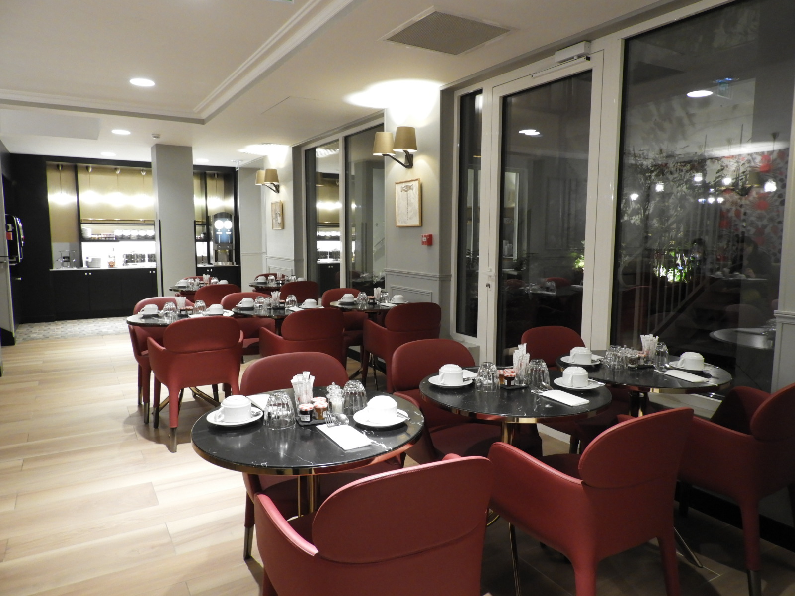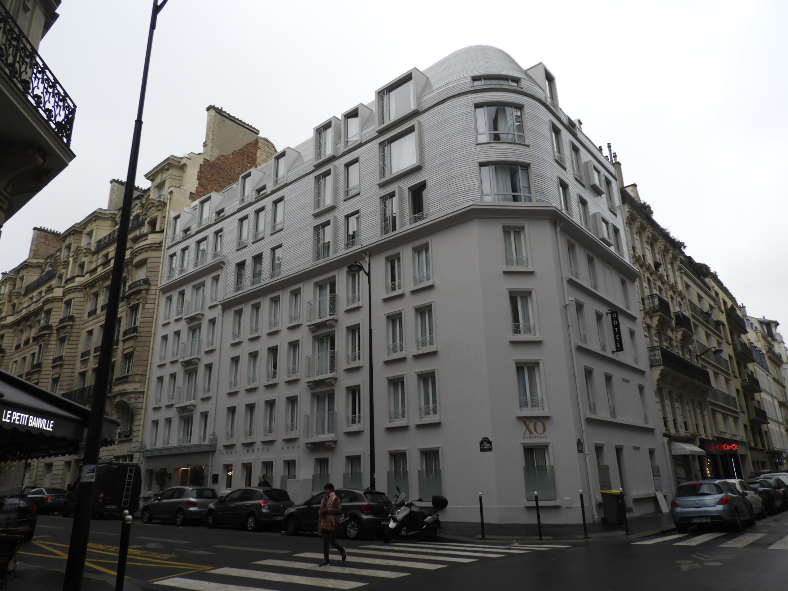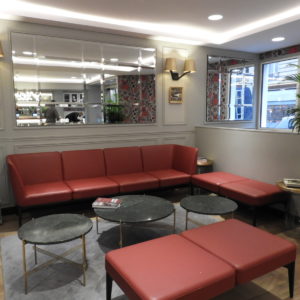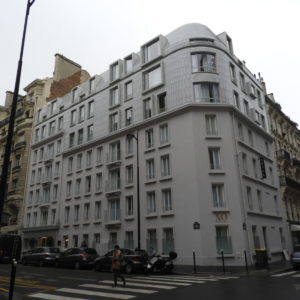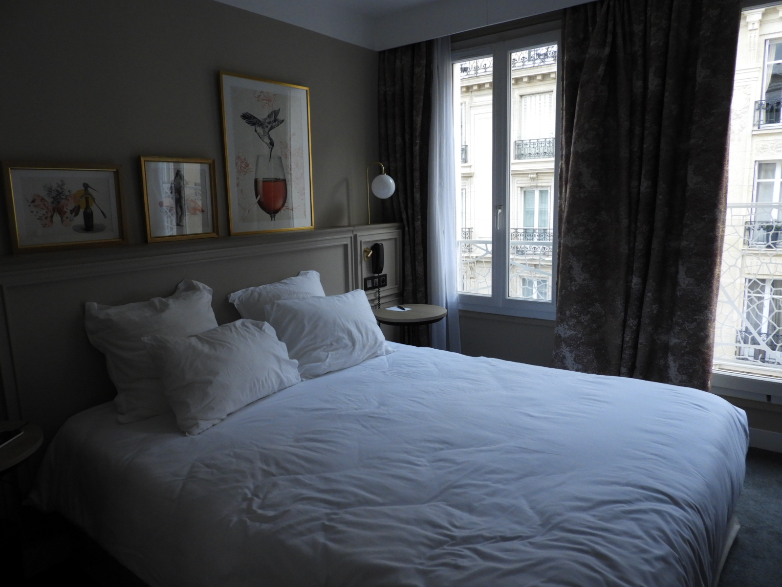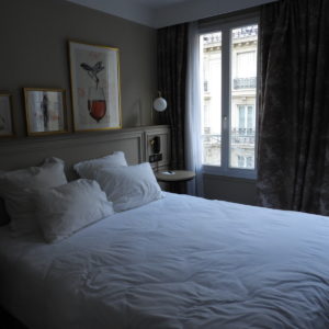O hotel fica bem localizado na região do 16° distrito de Paris, que é residencial mas próximo de comércio, restaurantes e metrô. A vista da nossa janela era um clichê perfeito de Paris: a fachada típica do prédio vizinho, com seus janelões que revelam parte do estilo de vida parisiense, chega a ser tão incônica quanto à própria torre Eiffel vista no horizonte da cidade. A tranquilidade das ruas, unida à calmaria do fim de semana também ajudaram a criar uma atmosfera romântica da capital. O hotel ocupa um belíssimo edifício inteiramente reformado que reúne sobriedade e minimalismo contemporâneos ao charme da arquitetura de Haussmann.