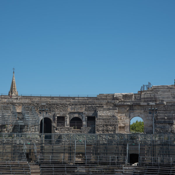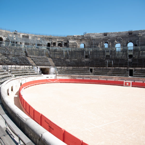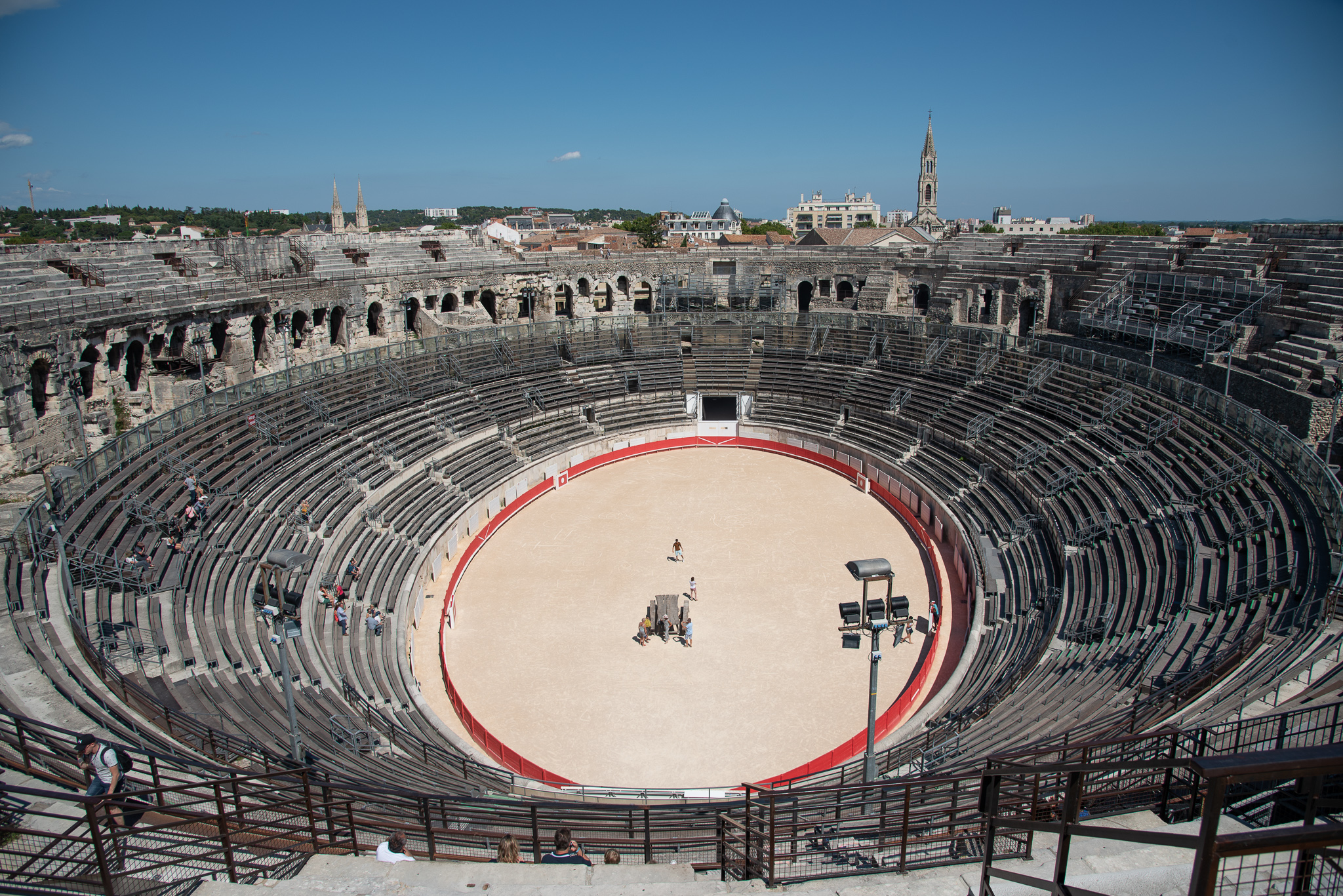 O anfiteatro romano de Nîmes é o mais bem conservado exemplar do período romano deste tipo de construção, mesmo não sendo o maior construído durante o império. Em seus tempos áureos, ele era dotado igualmente de uma cobertura para proteger os espetactadores do sol e intempéries. Com capacidade para cerca de 24 mil espectadores, sua utilização clássica no período romano acontecia em torno dos combates de gladiadores.