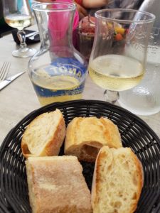 Pão e água potável são servidos gratuitamente em todo restaurante. Os franceses tem o costume de acompanhar as principais refeições com fatias de baguette – o que explica as filas imensas em algumas padarias na hora do almoço – ou um pãozinho pequeno, chamado de pain serviette, “pão toalha” em tradução livre. Este pãozinho tem uma função bem simples : limpar o molho do prato. Existe até um verbo específico pra isso : saucer, em tradução literal é molhar, mas no sentido de limpar o molho do prato mesmo (sauce é molho). Os garçons mais atentos em geral trazem cestinhas de pão quando percebem que elas ficam vazias ao longo da refeição. Além de servir pra limpar o prato, o pão também acompanha os queijos, sevidos antes da sobremesa (ou como sobremesa pra quem não é fã de doces).