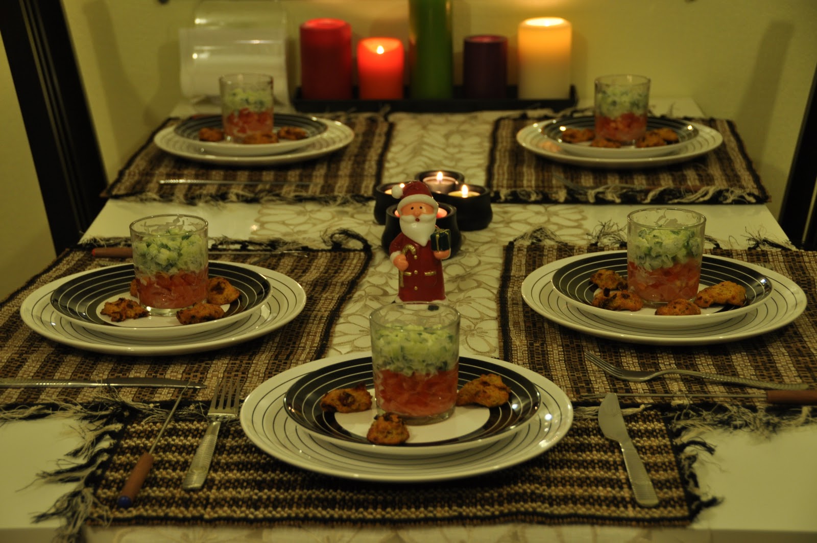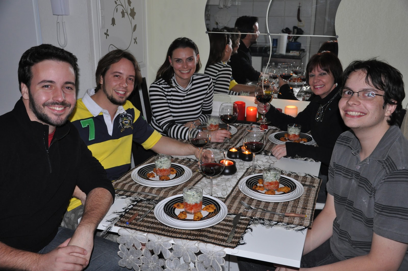 O menu foi escolhido quando a família ainda estava no Brasil. Entrada: verrine de pepino, tomate, salmão defumado e molho branco com alho e cebolinha, além de cookies de tomates secos, parmesão e chorizo. O prato principal fugiu bem da tradição do peru e chester: peito de pato gordo ao molho de manga, acompanhado de aligot, que é um purê de batatas com queijo. E a sobremesa, fondue de chocolate, pra estrear o presente que ganhamos de mamis, nossa panela de fondue.