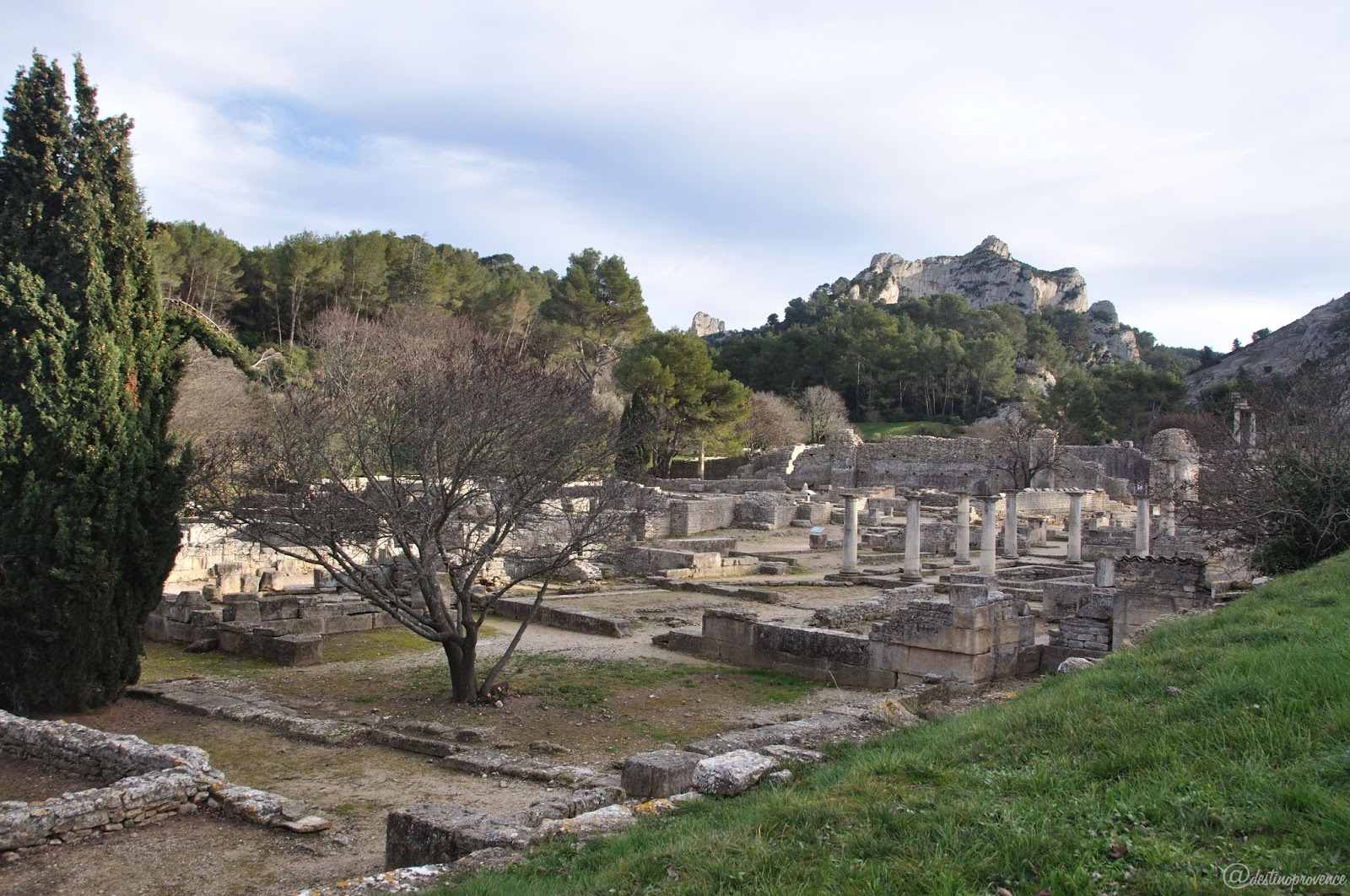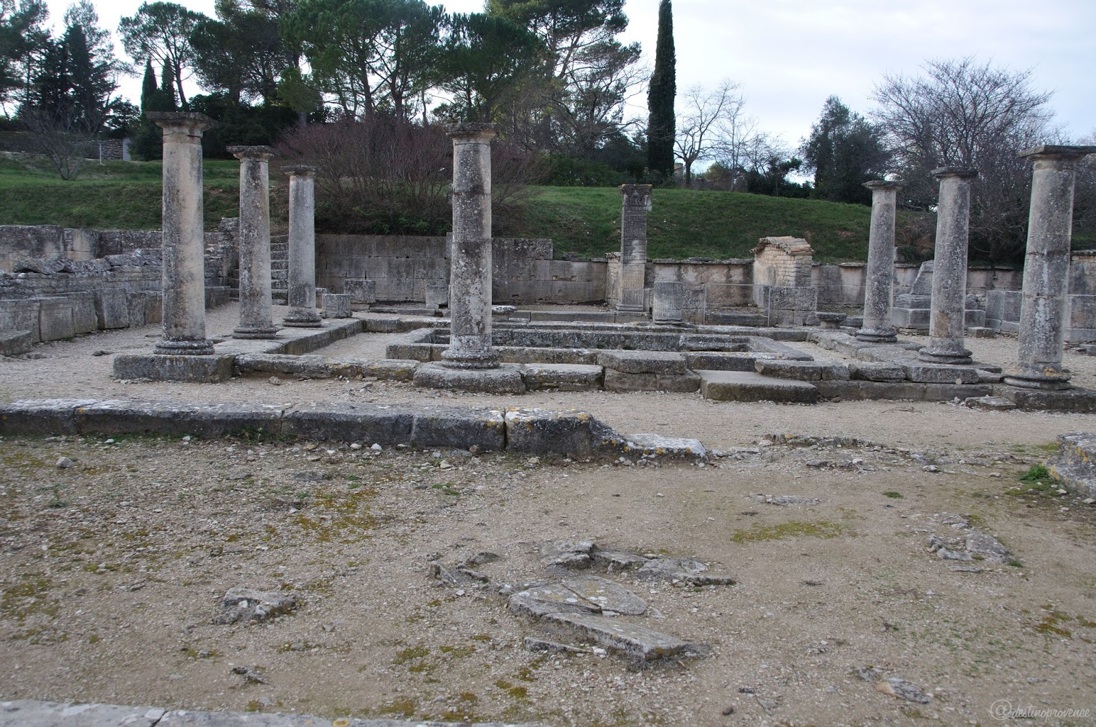 Apesar de termos feito a visita durante o inverno, a paisagem é bem bonita e a luz de fim de tarde de janeiro coloriu bem o relevo e a vegetação, e fez valer a pena o passeio. Uma das moças que trabalha no local nos aconselhou a voltar em abril, época em que a primavera está avançada e a paisagem ganha tons mais vivos. Voltaremos, certamente, pois ainda temos a visita do monastério de Saint-Paul de Mausole, que fica bem ao lado do sítio de Glanum, pra fazer (o centro cultural fica fechado entre dezembro e março, reabre em abril).