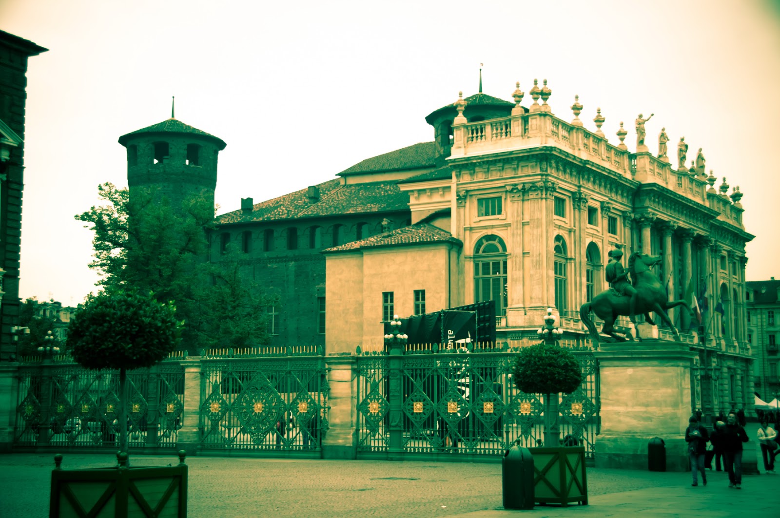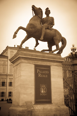 Chegamos na Piazza Castello, onde ficam o Palazzo Madama Torino, com parte da fachada em estilo barroco e parte em estilo medieval, o Palazzo Reale com seu imenso jardim e o Teatro Regio. O que nos surpreendeu não foi a arquitetura ou os palácios, mas grupo de indígenas que me pareciam americanos e que estavam tocando músicas na praça, no mínimo inusitado, mas a gente vê dessas coisas por aqui. Depois de dar uma voltinha pela praça (não entramos em nenhum palácio), descemos a Via Po, que termina no rio Po, o principal da Itália, com seus 652km de extensão, e nos dirigimos ao ponto de encontro, em frente ao Museu do Cinema, que também não visitamos.