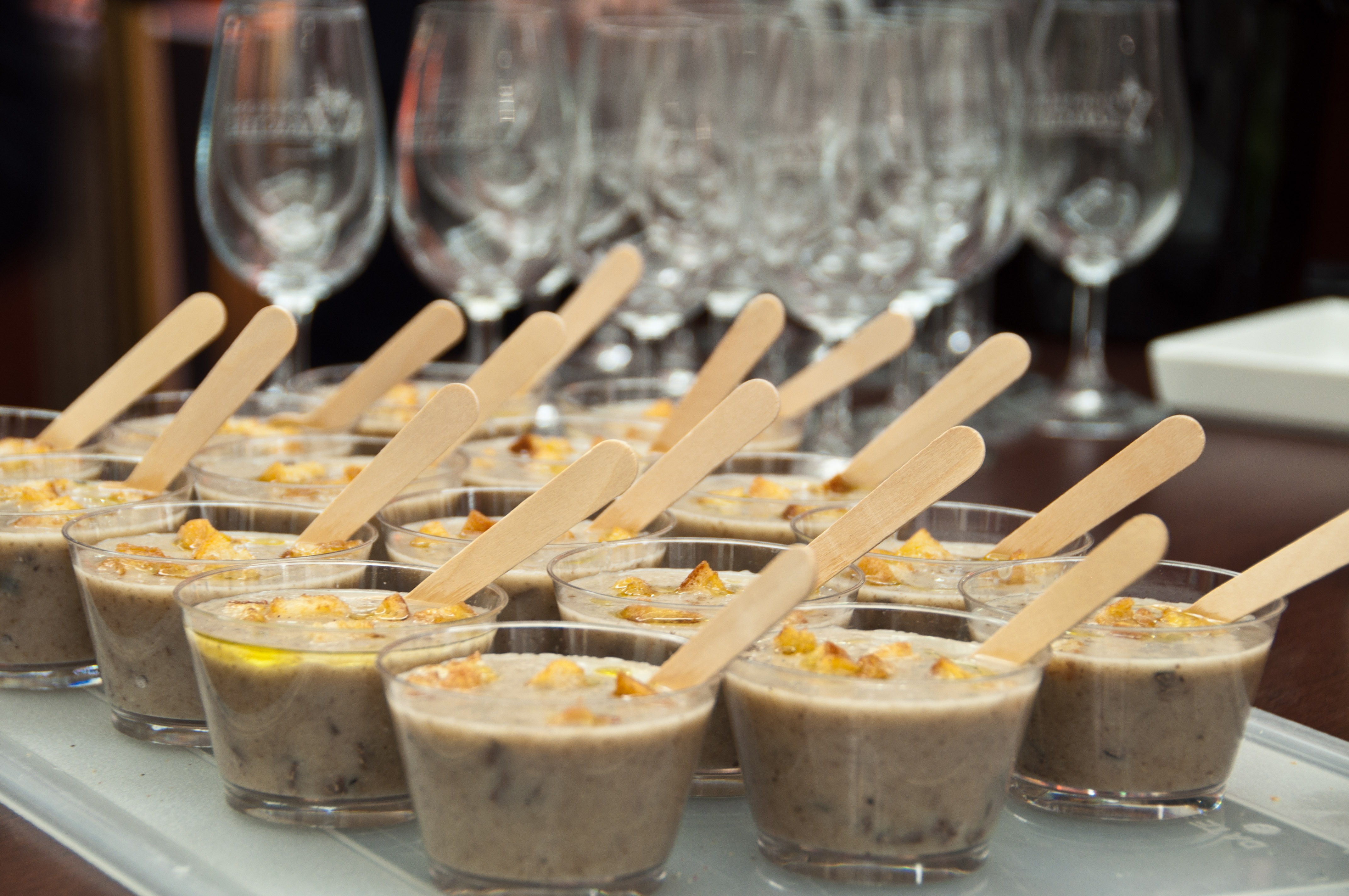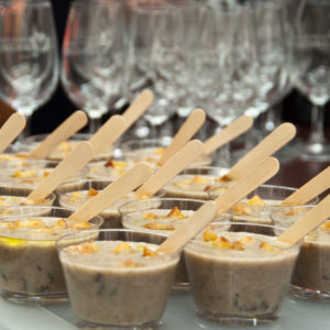 Começamos pelo creme de cogumelos e trufas, acompanhado de torradinhas para o toque crocante. A receita é simples: 500g de cogumelos de Paris, 1 litro de caldo de carne ou legumes, um pouco de manteiga e 150ml de creme de leite líquido. Picar grosseiramente os cogumelos, refogar na menteiga e em seguida cozinhar no caldo durante 20 minutos. Acrescentar o creme de leite e bater no liquidificador ou mixer para homogeneizar. Picar a trufa e colocar no fundo das tigelas antes de servir, cobrir com pedaços de torrada. Para harmonizar, a escolha feita foi o vinho branco Dom Venitia.
