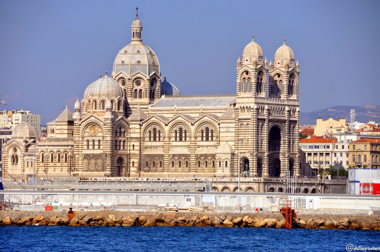 Construída em estilo bizantino romano, entre o porto velho e novo porto de Marselha, e ao lado do bairro Panier, o mais antigo da cidade, a Basílica-Catedral Santa Maria Maior é única catedral edificada durante o século XIX na França, e sua construção demorou de 44 anos. As cúpulas fazem alusão ao oriente, e os sinos da catedral remetem ao ocidente, lembrando que Marselha, principal cidade portuária do mediterrâneo, é também conhecida como a Porta do Oriente graças às trocas comerciais realizadas ao longo dos séculos por via marítima, e a intenção do arquiteto Léon Vaudoyer era incorporar no projeto do edifício tal característica.